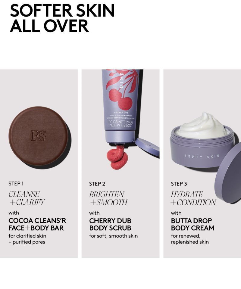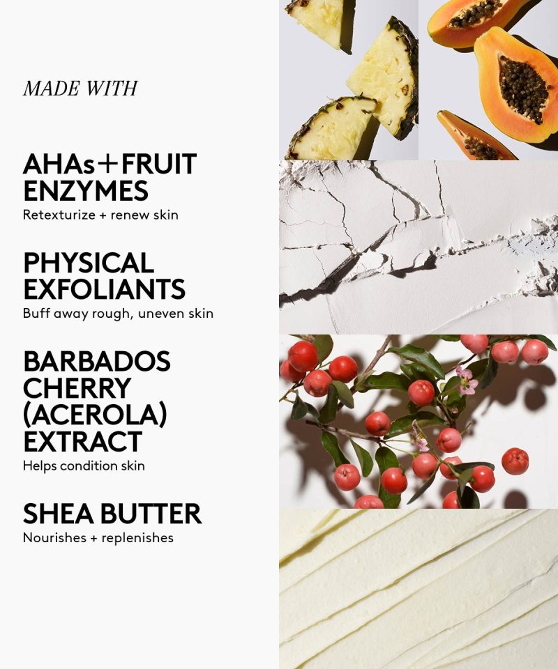 The Barbados Cherry banger for unimaginably soft. smooth skin. Powered by AHAs. fruit enzymes and sugar. this triple action scrub retexturizes. smooths and conditions from head to toe for a totally renewed glow.