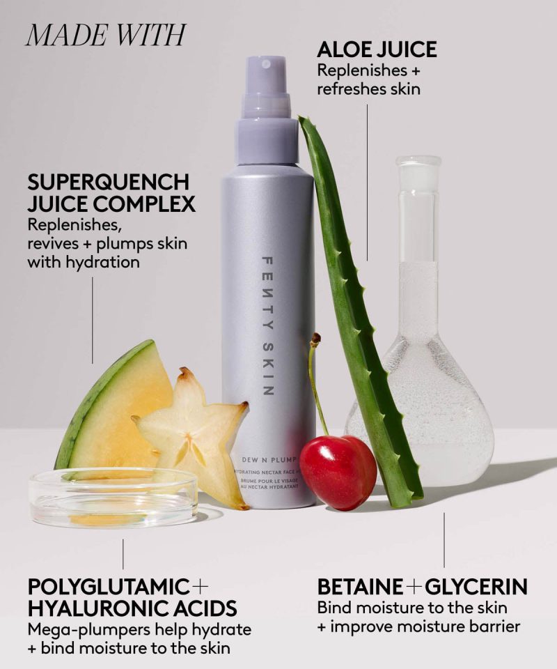 Dew N Plump Hydrating Nectar Face Mist is the spritz skin can’t resist. Like a soft cloud floating onto your skin. this ultra-fine mist delivers a refreshing burst of hydration. It’s light as air but heavy on benefits for plumper. bouncier skin while strengthening skin’s moisture barrier in just one use. Instantly wrap your skin in a sheer veil of moisture with a delicate emulsion of droplets infused with mega-plumping Polyglutamic and Hyaluronic Acids. plus moisture barrier-boosting Betaine and Glycerin. Spray on throughout the day or over makeup for a juiced-up pick-me-up anytime. anywhere.