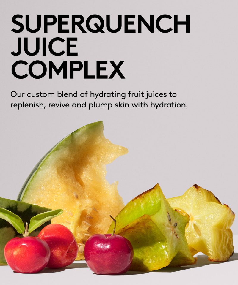 Dew it all with a serum that hydrates. plumps. boosts skin’s moisture barrier and gives an instant glow. Powered by our hydrating SuperQuench Juice Complex. moisture barrier-boosting Panthenol and mega-plumping Polyglutamic + Hyaluronic Acids. This glow serum comes through drippin’. so there’s never a dull. dry or uneven moment.