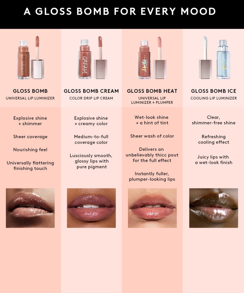 Intense shine. ultimate lip gloss must-have. Fenty Beauty Gloss Bomb adds the perfect finishing touch to your Fenty Face. Feel and look fabulous!