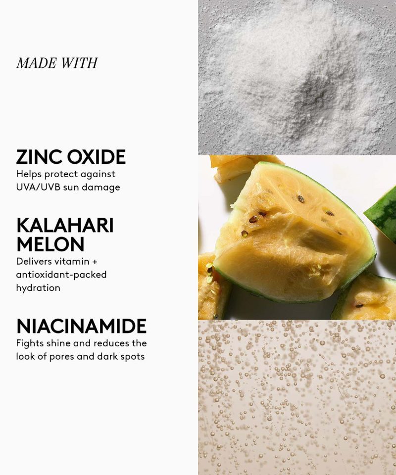 Boosts skin’s hydration and moisture barrier. Improves texture. tone + elasticity. Powered by Hyaluronic Acid. Niacinamide + mineral SPF—great for sensitive skin.